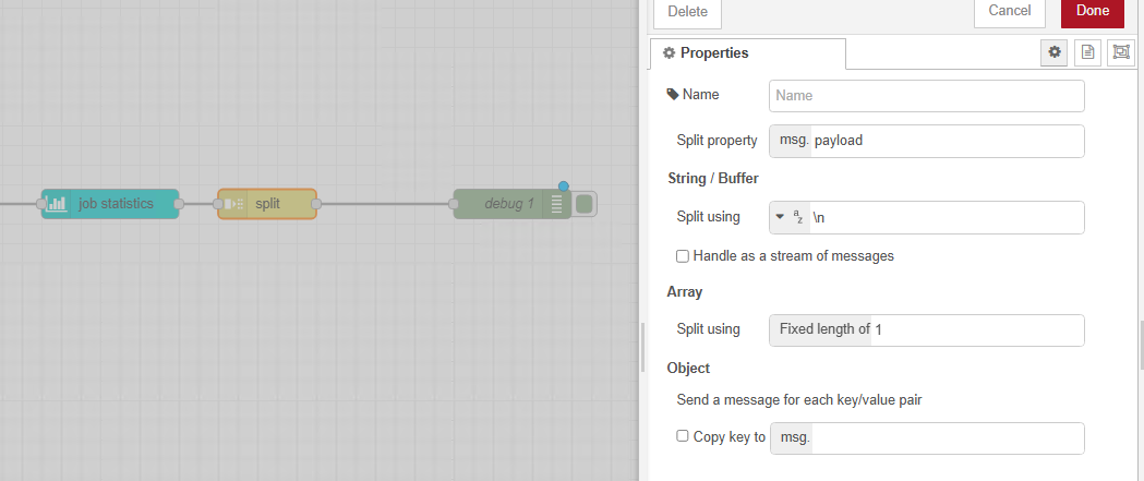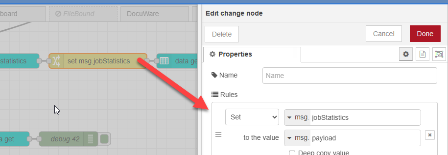 Change copy the information from msg.payload to msg.jobStatistics