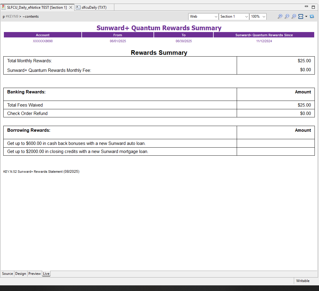 This template and the accompanying Workflow process were originally designed by Ricoh, our OL Connect licensor. to provide emailed daily notices for one of our credit union clients. The HTML pages generated by the Create Web Content plugin are merely for proofing, as the actual end result of the Workflow process is an XML file we upload to Ricoh to distribute through their email server. I am reluctant to alter the Workflow process.