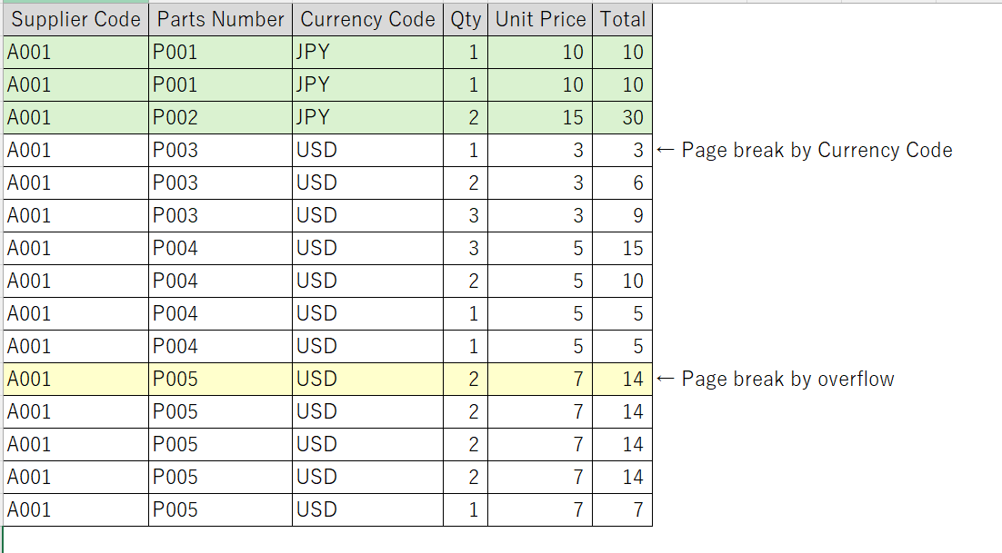 The image below shows a sample of the input data. Page breaks are based on the currency code. In this case, the data is split into two records; however, even if the records are separated, I want the second record to use Master Page 2 instead of Master Page 1. Could you please advise how to apply Master Page 1 only to the first page?