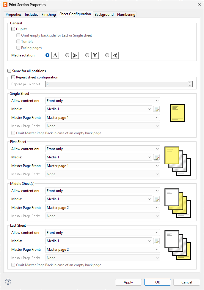 To make sure that only the first record has “Master page 1” applied as for Single Sheet and First Sheet, you can apply something like the following to make sure that all other records have only “Master page 1” applied.