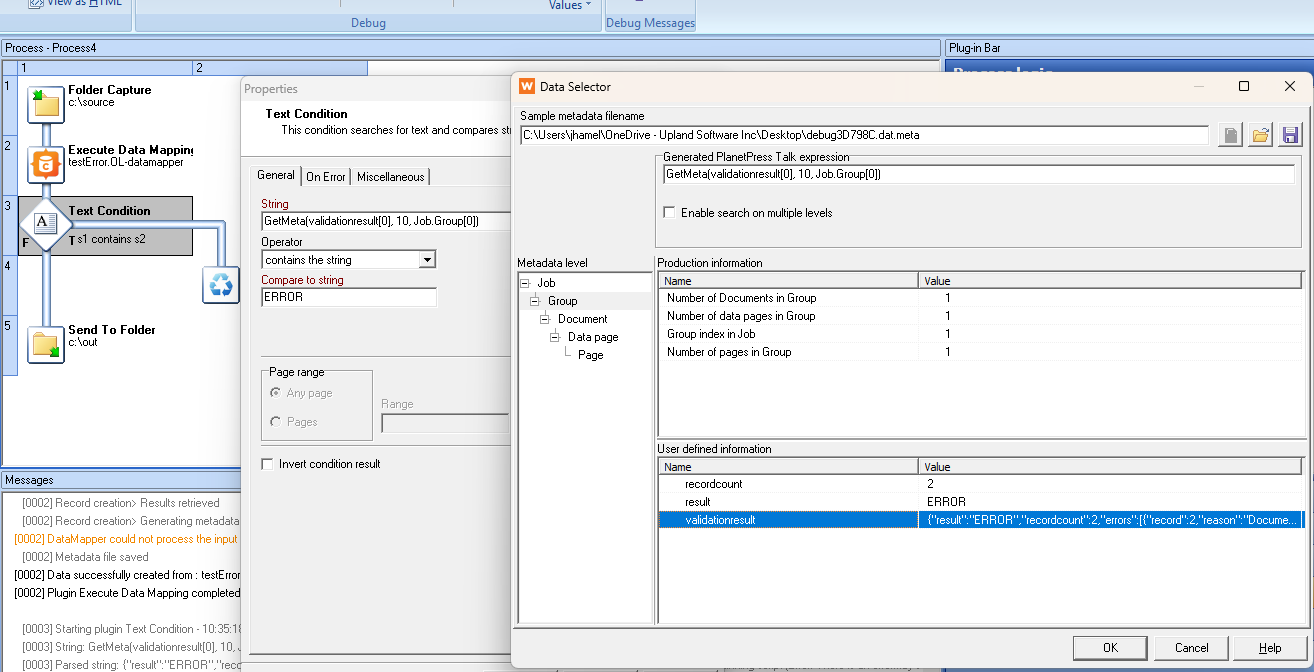 Then setup a Text Condition that look at the validationresult at the Job.Group level and compare the result found with either ERROR of some specific keyword that you can add in your error handling in the Datamapper. This would allow you to act differently on the error produce.