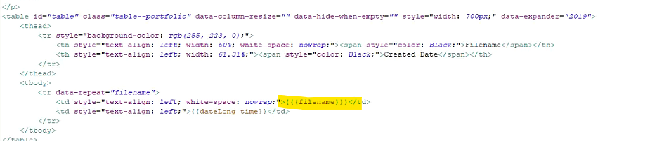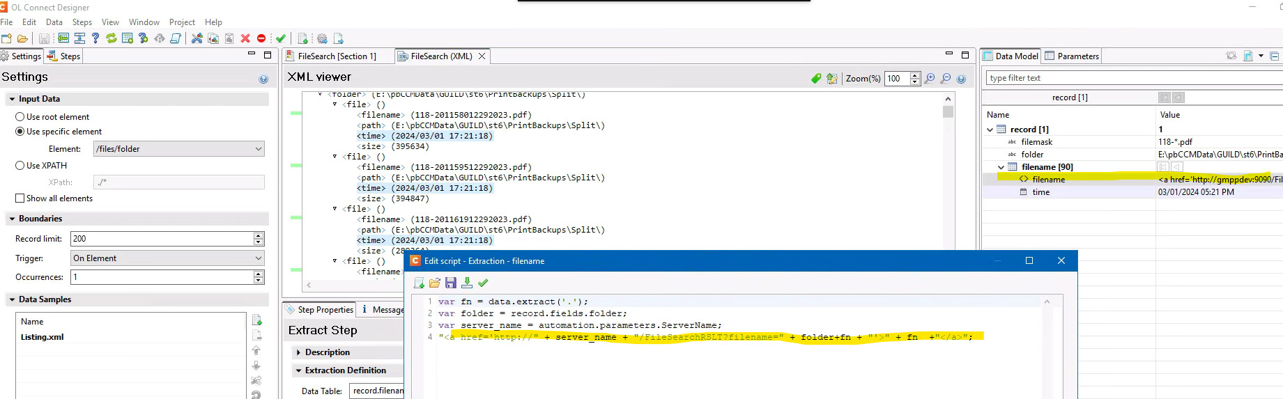 Or you can build your hyperlinks directly into the values from your datamapper. That’s what I do. I have built a search page that lets my users search for a particular output file. The first web page is static, with a form element that the users complete. It isn’t a Connect Template but could be. The Workflow Process that receives the HTML request does a Folder Listing, which produces an XML file. In my data mapper I have a detail table, for each record in the source XML it creates a hyperlink: