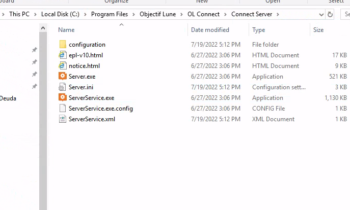 Sometimes the restart does not work properly. Stopping and restarting services requires the following executable to be launched manually (Server.exe), as ServerService.exe does not work when launched manually: